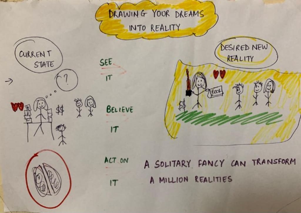 Picture your goal and put it on paper. Make a drawing of where you are now and where you want to reach. See it, believe it, and act on it. Stick that drawing on the wall across your bed, where you can wake up to it every day.