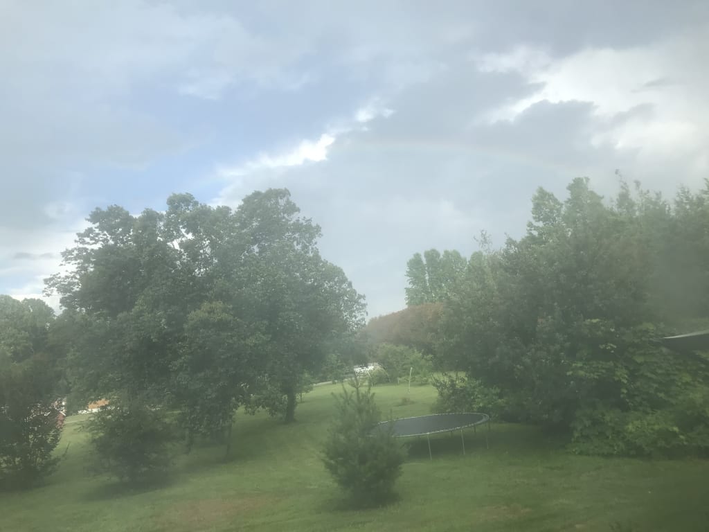 Later, a while after I made it home, my dad looked out of the window beside him, saw the sunlight shining through the clouds, and said, “Go look through the other window! There oughta be a rainbow!”