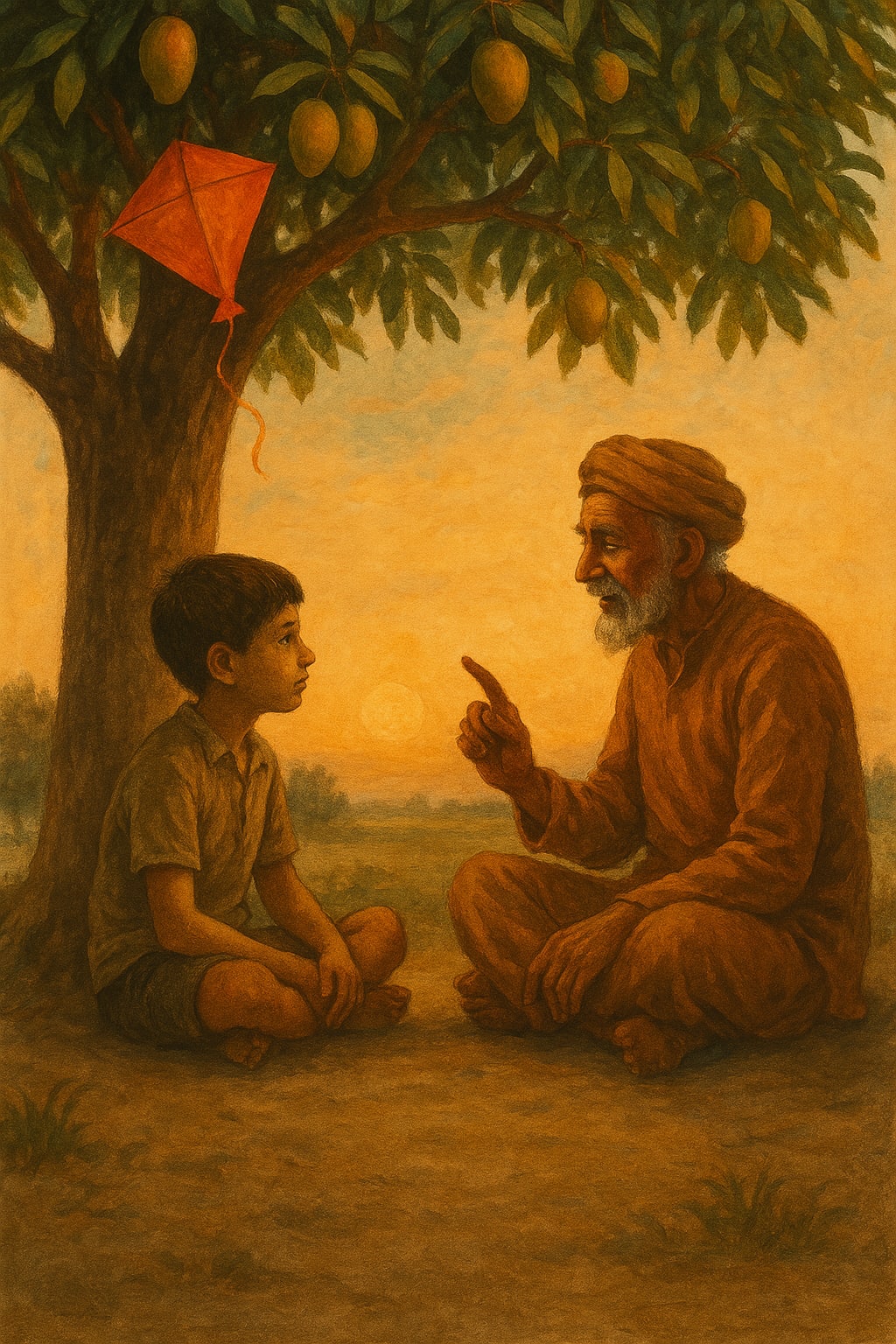 One evening, a young boy named Sami came to him, slumped with disappointment. His kite had fallen into a well, and the neighborhood boys had laughed. His confidence, like the kite, had sunk. Baba Haroon listened quietly, then smiled and said, “Let me tell you about a man who planted mango trees where none could grow.”