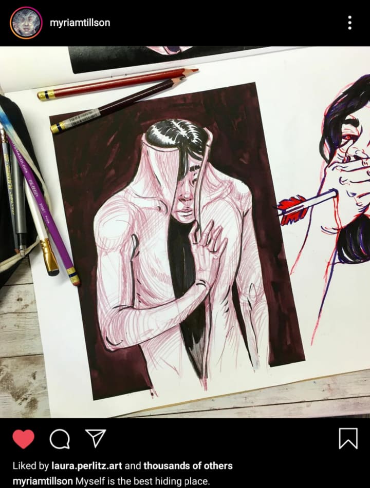 I read the caption: “Myself is the best hiding place.” And there it is. Connection. Though the subject may seem dark, its sincerity inspires a tender sense of joy: the joy of knowing that you are understood, that you are valid, that you are not alone in this. This piece by Myriam Tillson feels like a hand reaching through the darkness, just to let me know that it's there. It’s the green light on the East Egg dock, the olive leaf in the mouth of a dove. “Hey,” it says, with solemn reverence. “I feel it, too.”