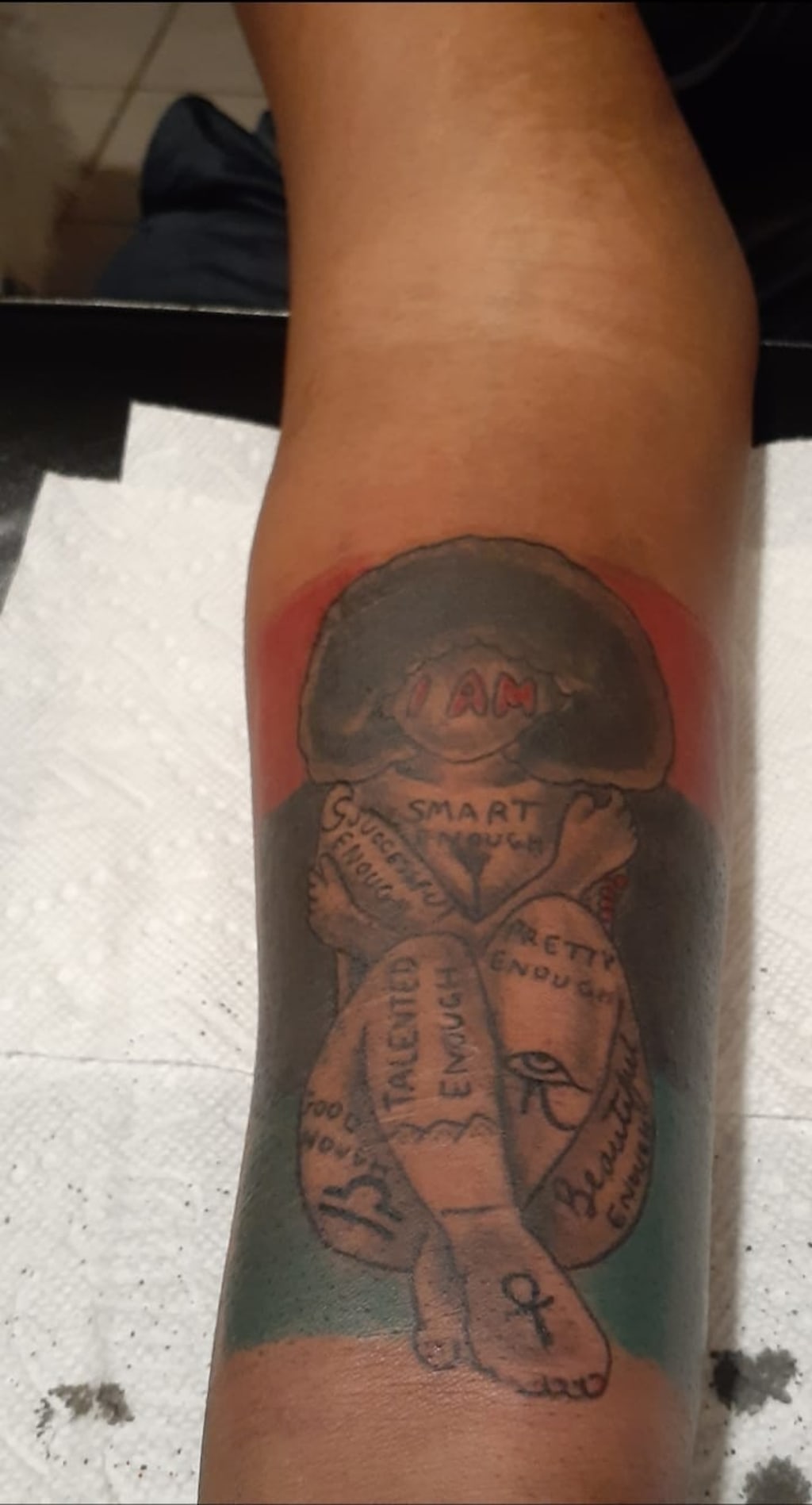 It came to a point in my life where I had to decide rather I was going to let my hardship control me and my life, or if I was going to feel bad for myself, and allow others too as well. I was going crazy in my head cutting everyday just trying to feel some type of something. I started getting older and realizing that the happiness starts with myself and learned I didn't have to be where I came from. I decided to get a tattoo that would remind me that I am smart enough. I am talented enough, I am good enough, successful enough, beautiful enough and strong enough.