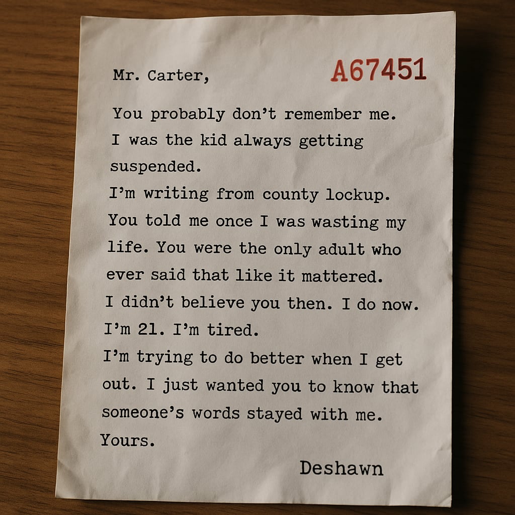 You probably don’t remember me. I was the kid always getting suspended. I’m writing from county lockup. You told me once I was wasting my life. You were the only adult who ever said that like it mattered. I didn’t believe you then. I do now.
