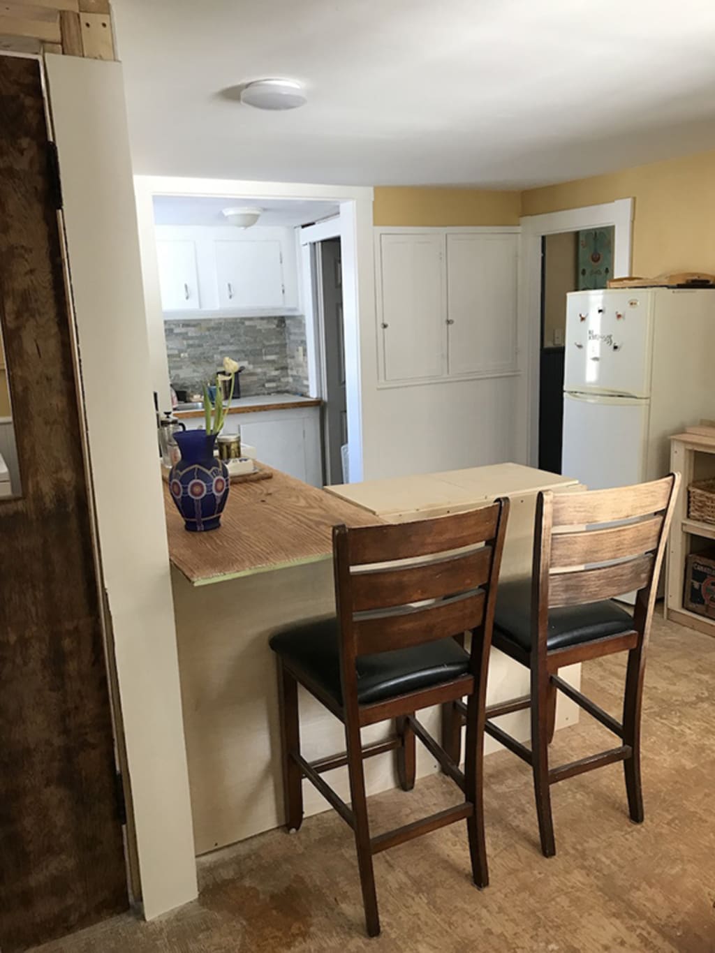 The beadbord on the lower half of the walls got 4 coats of white semi-gloss to cover the drab old navy blue. The walls got a special colour. For months I've been going to the hardware stores and picking up paint swatches and every time it seemed, I came back with the same colour despite the different brands of swatches. During a trip to Halifax to change the mattresses I had bought from Ikea from double to queen, and get straight lumber from Home Depot (How many times did I go to build with the straight, kiln-dried lumber I bought from our local Home Hardware, let it sit in the kitchen for a couple of days until I could get to it, finding the wood had seriously bent or twisted, rendering this wooden gold, useless?). I also came across a Habitat for Humanity Restore. A great option for building and home reno supplies and furniture. I found two perfect, sturdy wood and upholstered bar stools for the planned breakfast bar in the kitchen. I also found some good quality mistint gallons of paint for $15. So I picked up an almost fluorescent yellow, knowing I could tint it to the colour I want.
