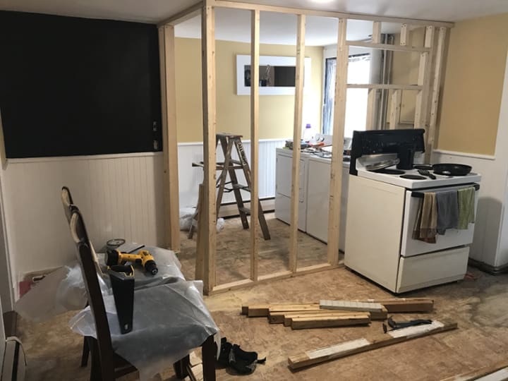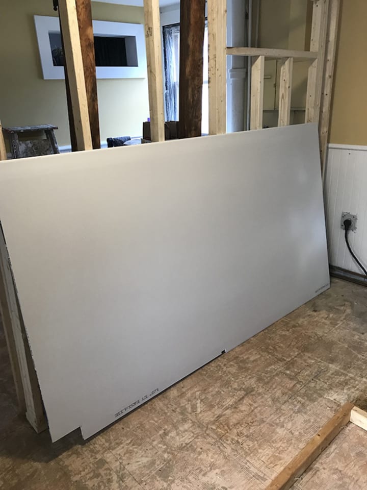 The drywall was fun. Two full sheets that I cut to size on my dining room table. There is a video going around on social media. Kind of a where there's a will there's a way video. Of a man taking a full-sized refrigerator off the back of a pickup truck and onto a small dolly, by himself. He manoeuvred that thing expertly and when it would have come crashing down onto anyone else, he got it softly into the dolly without straining himself. This is how I felt with these sheets of drywall. Getting them onto the table and then off the table through a doorway and standing them up in a room that is 2 inches taller on one side than the other, was no easy feet and when I had the both in place I did let out the loudest holler and hoot and did my seriously happy pants dance all around the kitchen, singing, “I built a fucking wall, I am amazing...!!”