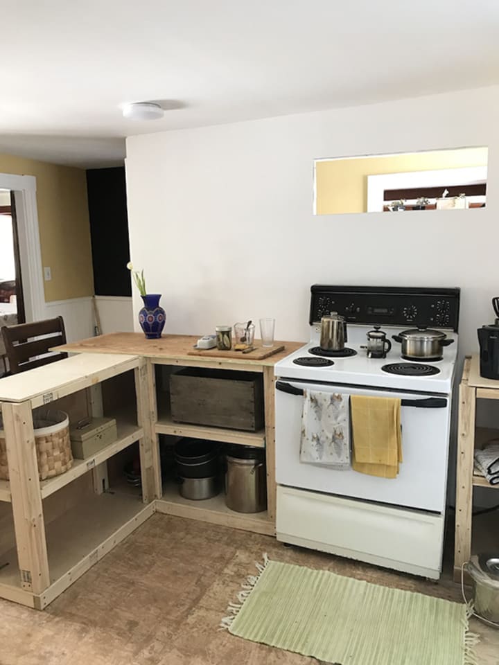 You all know how it looked before I began. It was a dark, dreary, melancholy room. Low on the value scale, both artistic and worth. There were no counters or cabinets. No cooking surfaces other than the stove, which sat at an angle and had a mismatched broiler door. The stove hasn't changed. It works, and I'm thankful for that.