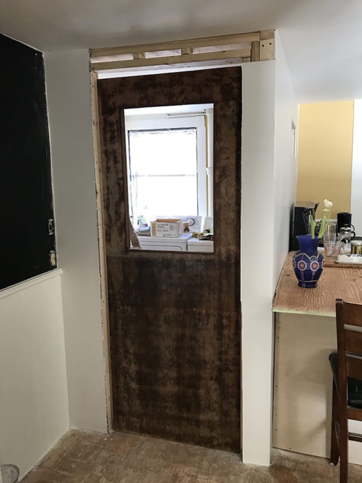 After the painting, I had collected enough wood to go ahead and start building the wall between the laundry and kitchen which I had envisioned the first time I looked at the realtor photos. Of course the floors and ceilings are not level, so each stud is a slightly different length. I left a cut-out the same shape and size as the cutout in the wall from the living room to the laundry area. To allow heat from the wood stove, and light from the laundry room window to come in. I also wanted to mirror the effect of space that the opening gives. I also framed out the doorway into the laundry room to hang one of the big old wood doors I've been hauling around with me since I found them in the forest in Squamish. It's perfect for there. I'll eventually get/make/paint a stained glass piece for the opening.