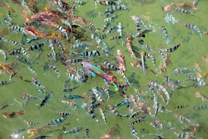 The Napoleon wrasse is a large, colorful fish known for its prominent hump on its head. They are found in tropical Indo-Pacific waters and are often seen around coral reefs.
