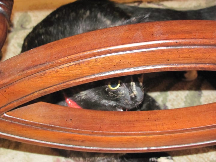 Like all animals, Aggie’s unique personality began to shine through. Like most cats, she is an accomplished climber and developed the habit of occasionally perching on top of one of the high-backed chairs in my dining room.