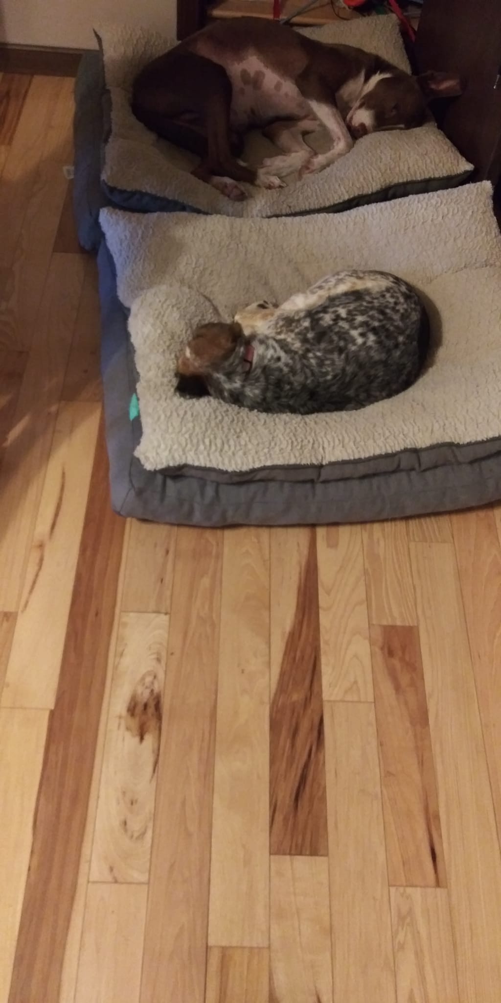 He outlasted her. Finally, Dixie got up, snarled at him, and took two steps forward to the identical plush bed next to hers. Carl happily curled up and was asleep before she could get her three circles turned and her new spot properly tamped down, growling, "Pups!"
