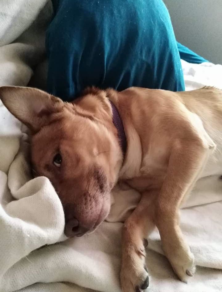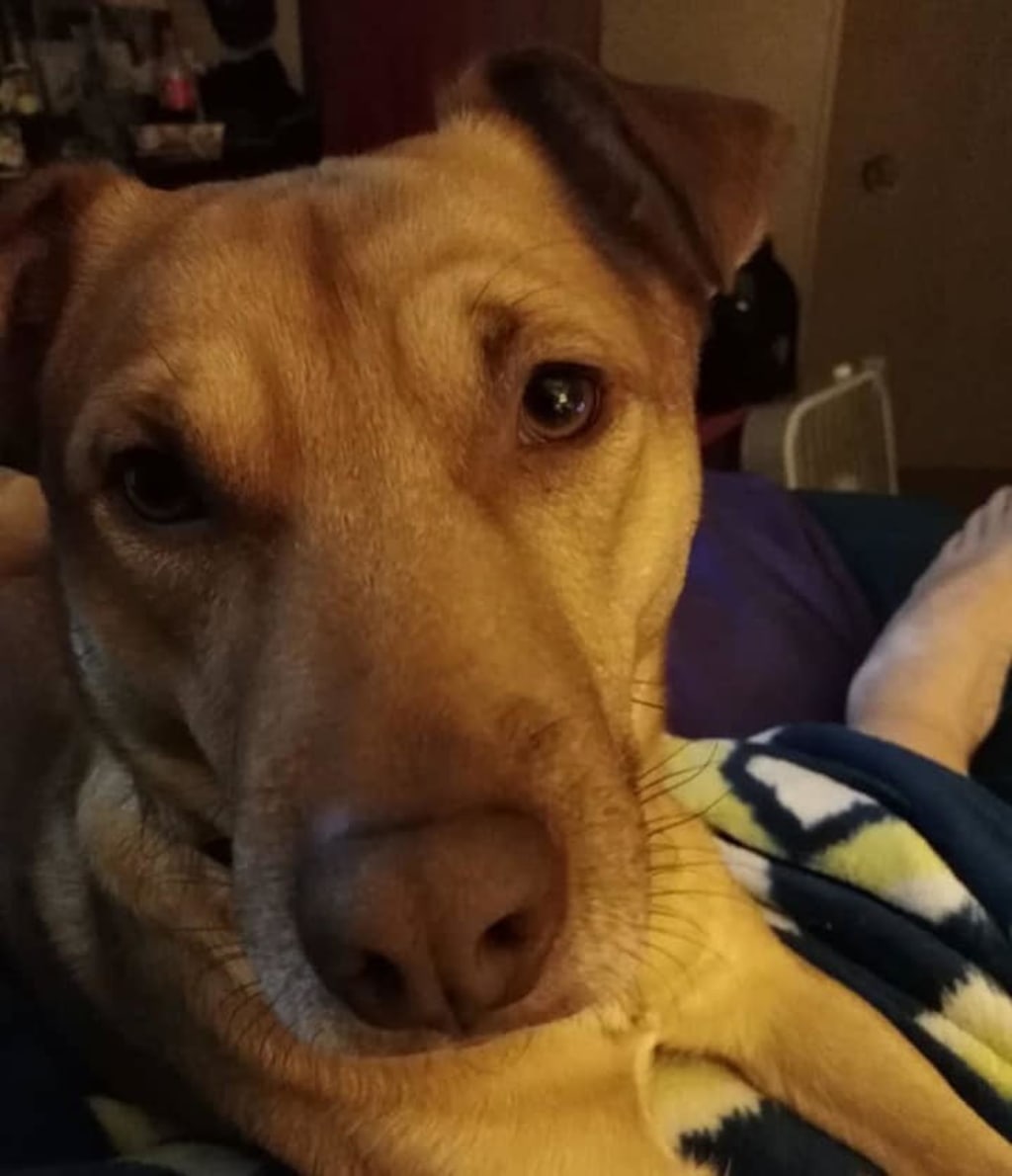 When my nephew brought the dog inside, we discovered it was carrying around it's own very populated flea community. When I ran my fingers around his body I found an indentation in his rib cage, as if he’d been kicked long ago. He was a cute little thing; like a golden-brown lab/terrier mix but small at about 30 pounds. When his ears weren’t flattened down, they flopped over, giving him a puppy look. The vet said at that point he was about a year old.