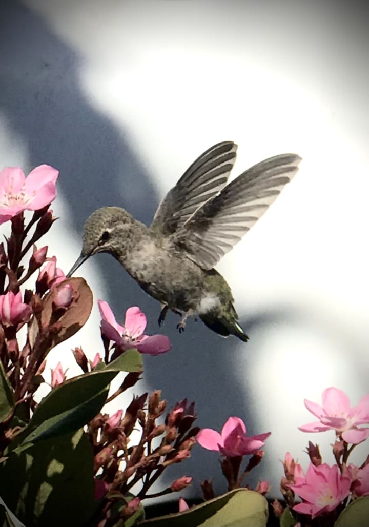 One day I was just walking back home after a stroll in the park. A big white construction van was parked on the street—my neighbors were again fixing something in their house. Suddenly a hummingbird appeared out of nowhere, and the van turned out to be the perfect background! I grabbed my phone and frantically snapped some photos. Later I cropped the van out, slightly adjusted the contrast and brightness—and lo and behold, there it was. Finally! My tiny little dream, captured in majestic beauty!