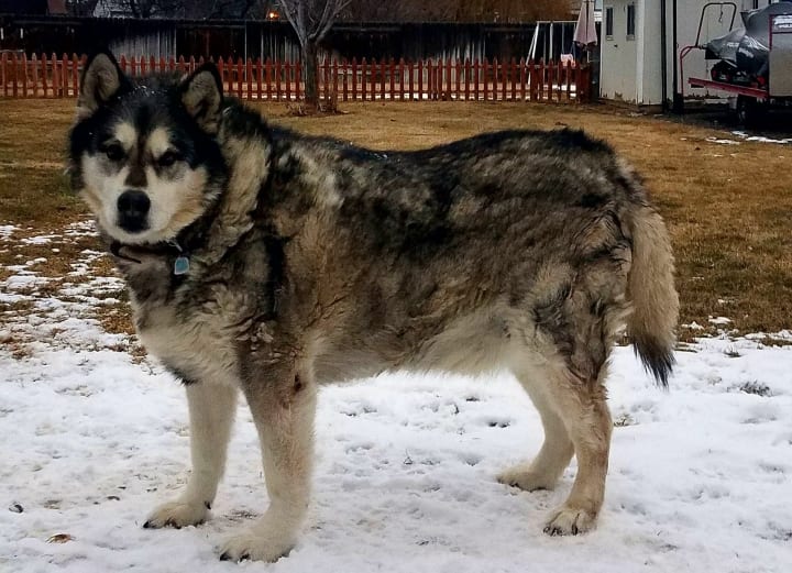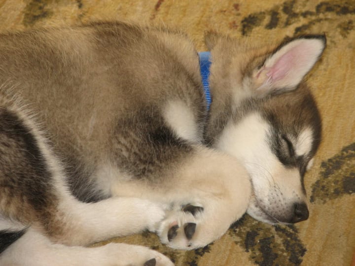 It was just my husband and I when we first brought Kenai home. My children had grown and moved out with families and rescued pets of their own. Kenai was not a stray. He was the first pure bred I had ever owned. A Malamute, whose father had been bred from the Wakon Giants. Kenai was also not the runt of the litter that I usually chose. He was, in fact, the largest pup in his litter although apparently not the bravest. His mournful, little howls every 2 hours on the hour each night for the first week made us question the sanity of our choice to adopt him. We had successfully raised six children to adulthood and here we were, subjecting our hard earned, well deserved, previously uninterrupted sleep to the equivalent of a crying infant. Every doubt melted away with just one look from those deep brown eyes. I lay beside his bed night after night, softly singing to him and stroking his front legs to calm his fears. He had won my heart like no other.