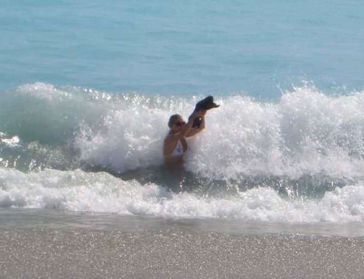 That wave was just too big for him - I'm standing on my tippy-toes! (My daughter just pointed out that it looks like I'm posing like the Lion King pose! I'm really just trying to keep the wave from toppling him)!