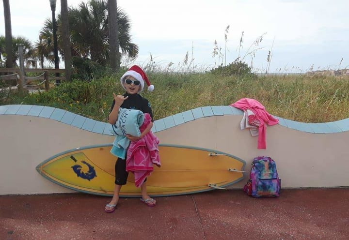 My Sweet Savannah Grace inherited Bailey's surfboard! She would make him proud!