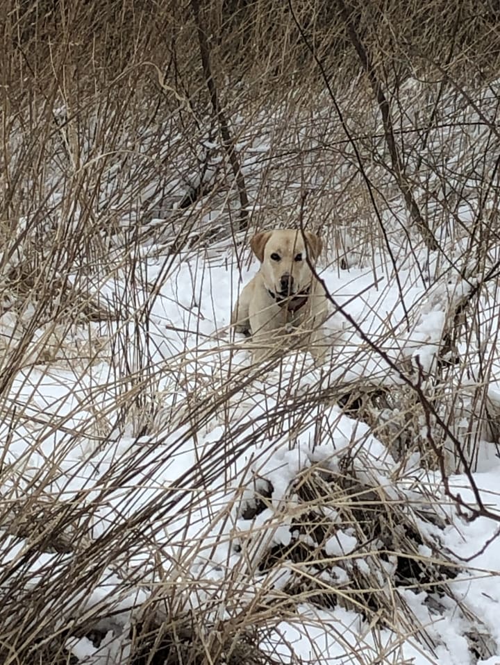 Several months later mom and dad went away. They left Morgan with a friend who lives near a large reservation, and I went up to visit and to retrieve him. It had just snowed. We decided to take him for an afternoon walk. As we got to the park, she released him from his leash! I wasn’t sure about this choice of action, and as soon as the leash came off, he dashed away! He had exploring to do! He crashed through some reeds and into some muddy water, dashed this way and that, came back to keep his eye on us, then ran off again. He’d stop to roll in the snow, or eat it. Each time he went a little further, but he always returned. Finally, he disappeared! When I realized it, we stopped and called him… no Morgan. We called him again… no Morgan. We called a few more times, then we doubled back to find him.