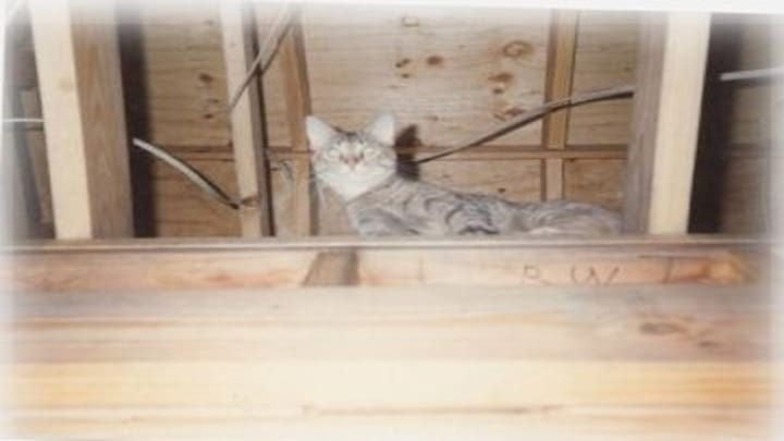 We were in the process of building our little cabin and had not completed the interior walls so, while the house looked finished on the outside, the inside was insulation and bare studs and rafters. Our patio door did not close all the way and Barney quickly learned how to slide it open enough for egress onto our big covered porch. To our horror, live mice began dropping from the rafters in the wee hours of the night thanks to The Nub’s wicked sense of humor. Many’s the time I’ve tangled myself in the covers trying to rid myself of a small, terrified mouse only to glance up into the rafters to see this face…