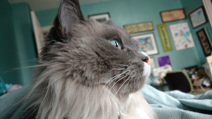 He seemed really chill. He didn't get up and move like the other cats did and, when I picked him up, he did purr, loud. But he was kind of nippy and I knew that indicated that he could have some social issues better dealt with with more cats than I had and specifically a cat way younger than I had. I tried to find a better cat that fit the bill and was closer to Prince's advanced age, but on the day I'd given myself an ultimatum, I picked him up and almost passed out from hearing his purr. I was calmed.