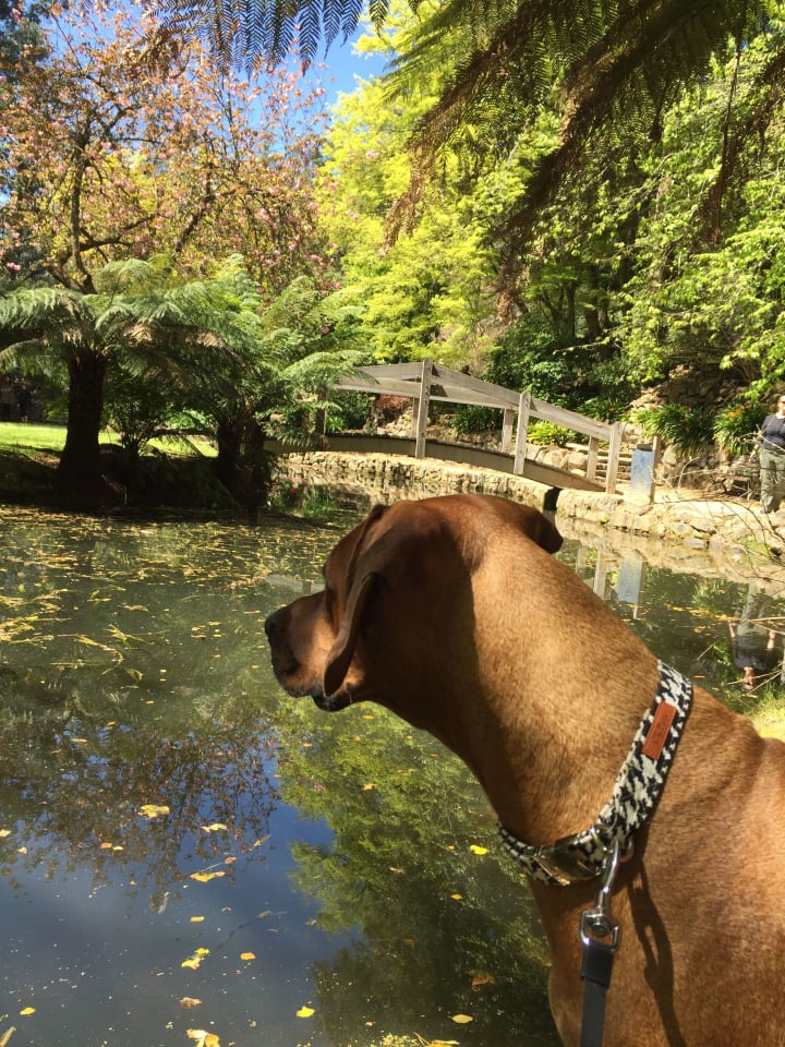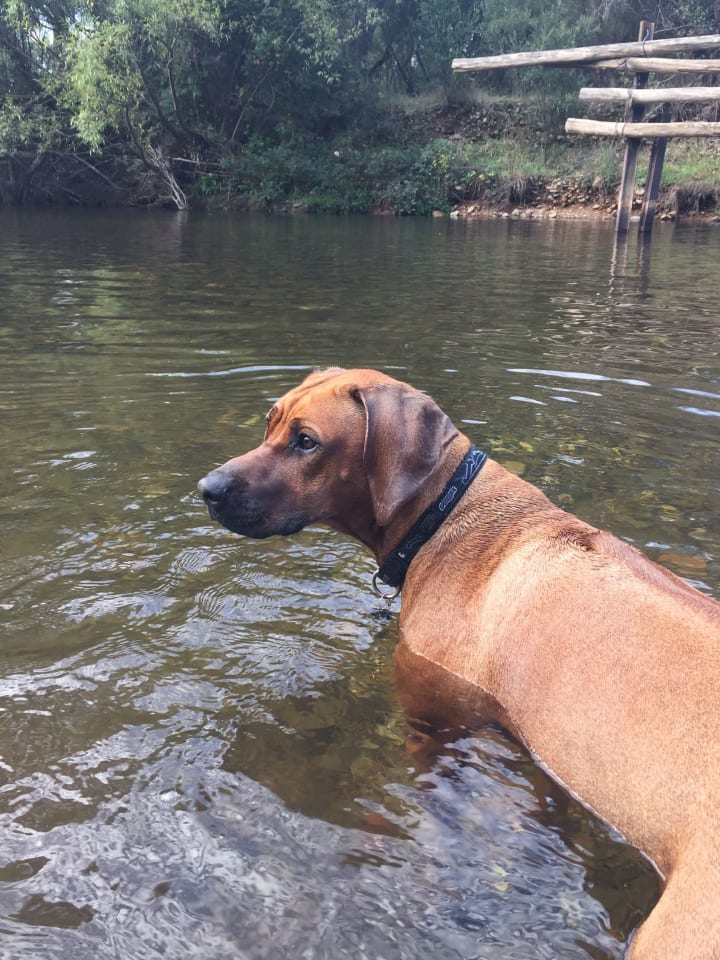 I coaxed and begged, tugging gently on her 15-foot-long leash, guiding her ever closer to the deepest part of the creek. At first, the creek bed was covered in small rocks, then thick sand as we went along. Walking was a challenge for me, but she seemed to be doing fine. I was so proud of her. By the time the water reached her chest, the sand had become littered with large boulders that were hidden beneath the water’s surface. We were churning up the water until it turned brown, and I was forced to feel around for the boulders with my feet.