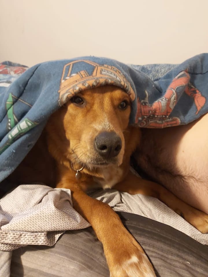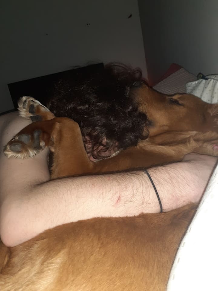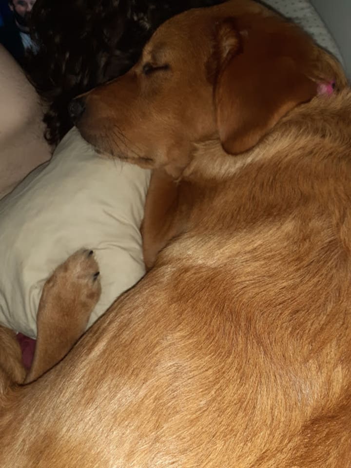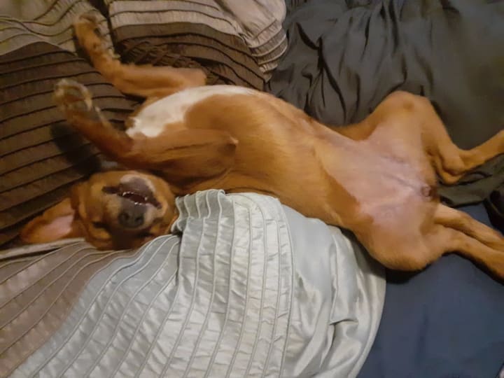 She's one of the only dogs I've met that loves to sleep like a human does. Head on the pillow and an arm around her. She needs to be as close as possible to you.