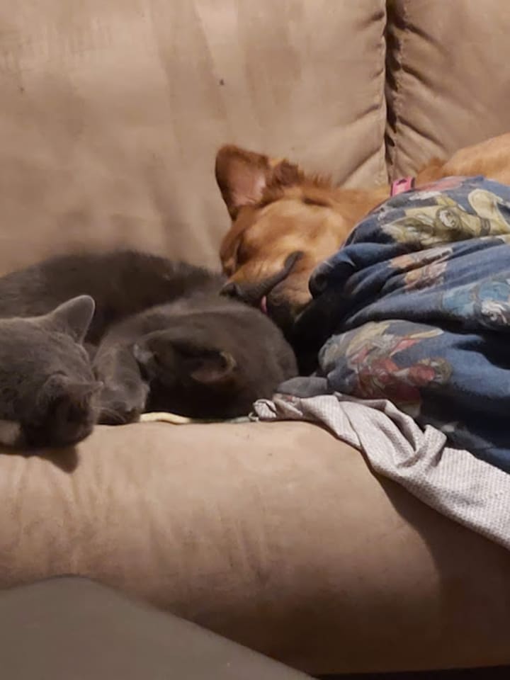 She loves animals of all shapes and sizes! Here's her with her best cat friend Indie. My other grey cat Lola is beside him. We own 3 cats and this cat was a street cat who likes to act like a dog and Bailee has taken to that.