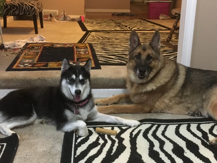 We have added to our pack and have lost some due to age. Currently we have the Big Guy, Gabriel, a 130-pound shepherd going on 10 years old this year. Ramona, another shepherd that will be turning seven this year and then the new love of our lives, Merry. A black and white husky.