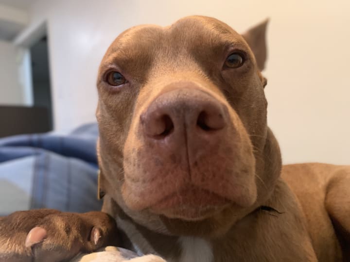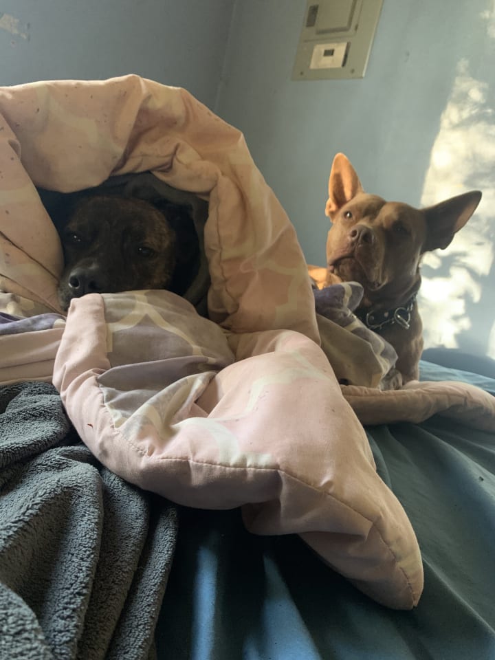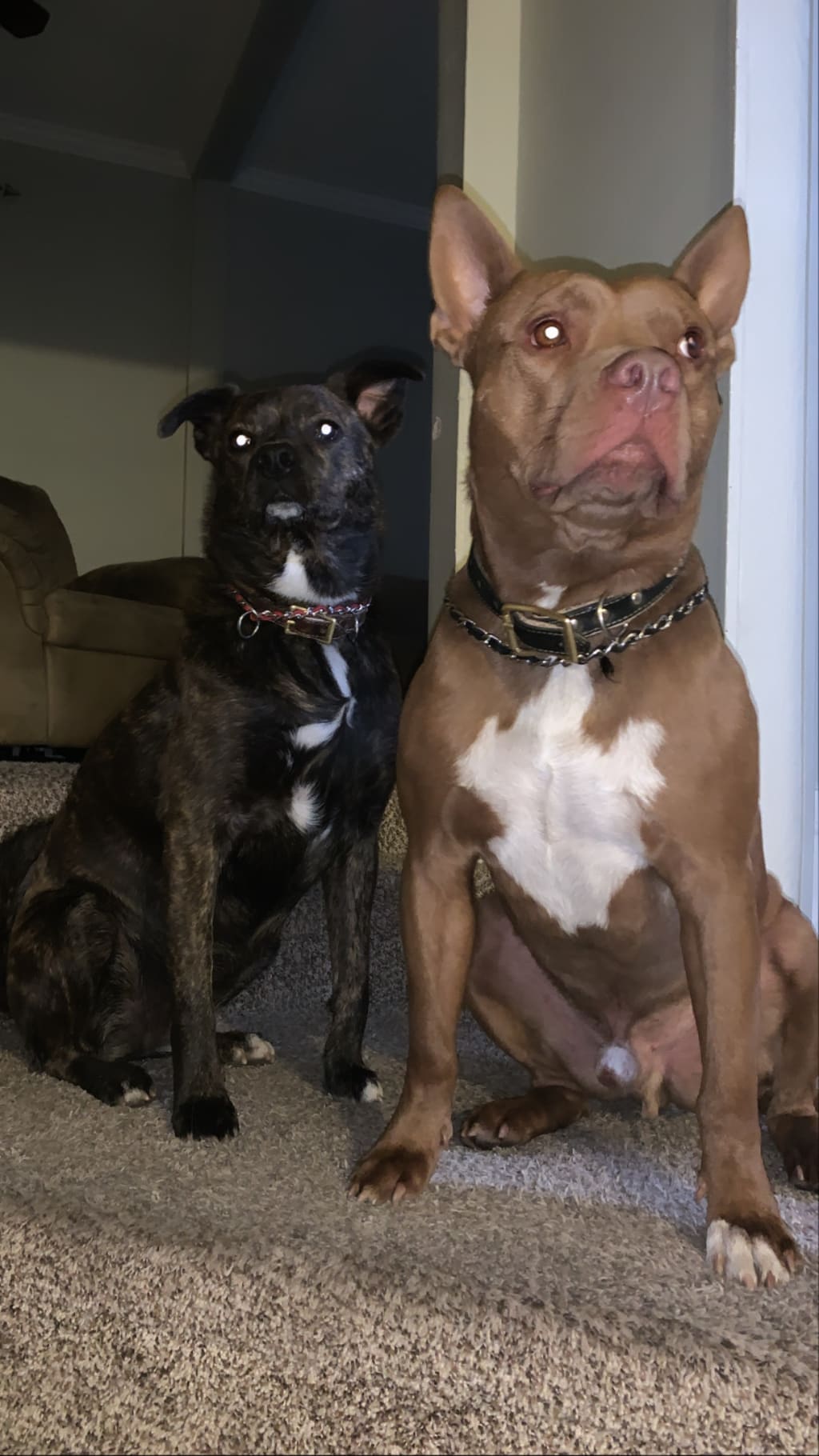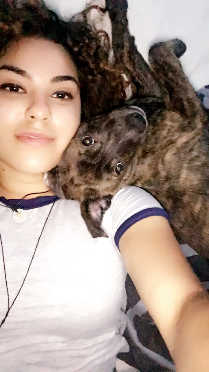 Simba became so close to me so fast. He would go with me to the bathroom just to sit there and stare at me. He would cuddle me every time I would lay down, and go under the blankets to be close to me. I was actually impressed and shocked by his behavior, he was the sweetest thing ever. The horrible things they say about his breed and having him as a pet were two opposite stories. He was such a sweet traumatized boy that all he wanted was to be loved. He wanted to be a good boy so I could praise him and give him love and affection. It was such that one day I caught him peeing inside the house, so as I had learned with Rahbyns trainer I went and got a magazine and rolled it to hit him in the butt, but as soon as he heard me saying his name out loud he froze. It was as if he couldn’t move. He saw me coming with the magazine and started shaking and crying uncontrollably while peeing himself as if I was about to beat him to death.