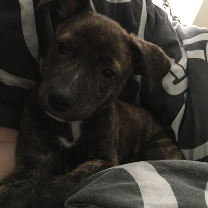 I was debating adopting this dog and after some time I finally grabbed my car and drove to see the puppies. Once I got there it was only one puppy since my friend had picked the other one. That led me to meet this little one, 6 inches tall, probably three month old brindle puppy with her dreamy watery brown eyes, looking lost and hopeless. I immediately fell in love and had to rescue her. We clicked as soon as she saw me, it was like if the sky had opened and was giving me a gift from heaven. I can swear I almost heard her say “take me with you” .
