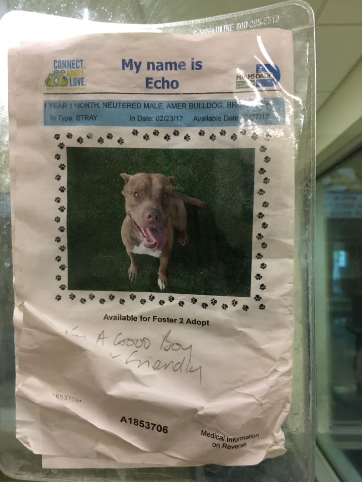 When I adopted him the lady told me his story. They had found him near a pit ring where they force Pitbulls to fight each other for money. They had found him running outside the place as if he had escaped. They said he was bleeding and that he was overly excited and because I was in Miami when I got him they had to say in his paperwork that he was an American bulldog mix.