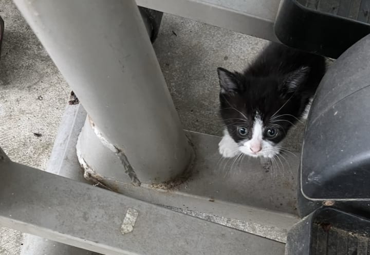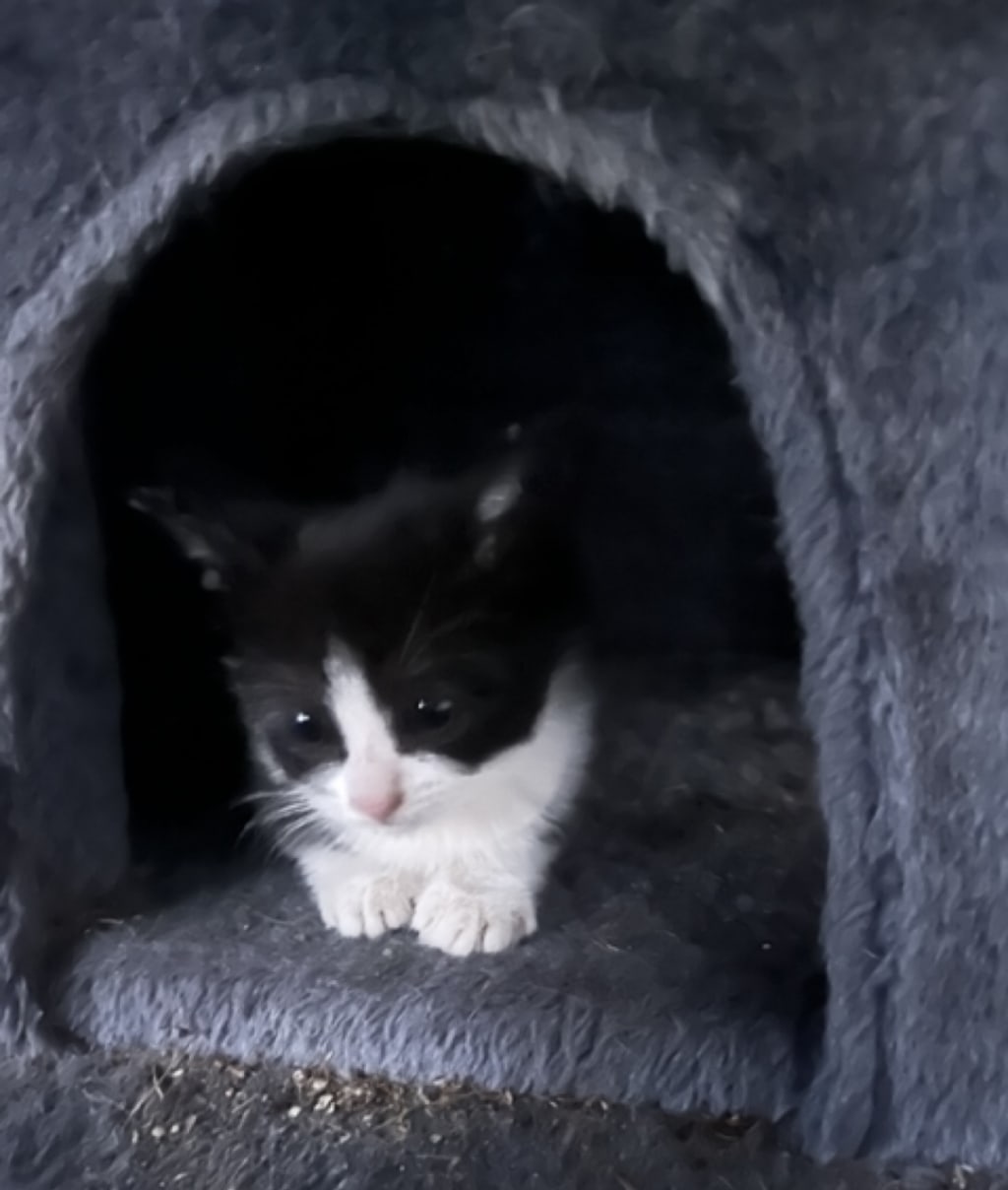 She limped and could not keep up with her siblings, and had a difficult time walking to the food bowl we placed in the backyard for the unhoused felines. Somehow, despite her tiny size, she began making her way around the house to the front porch, and my oldest son admired her tenacity.