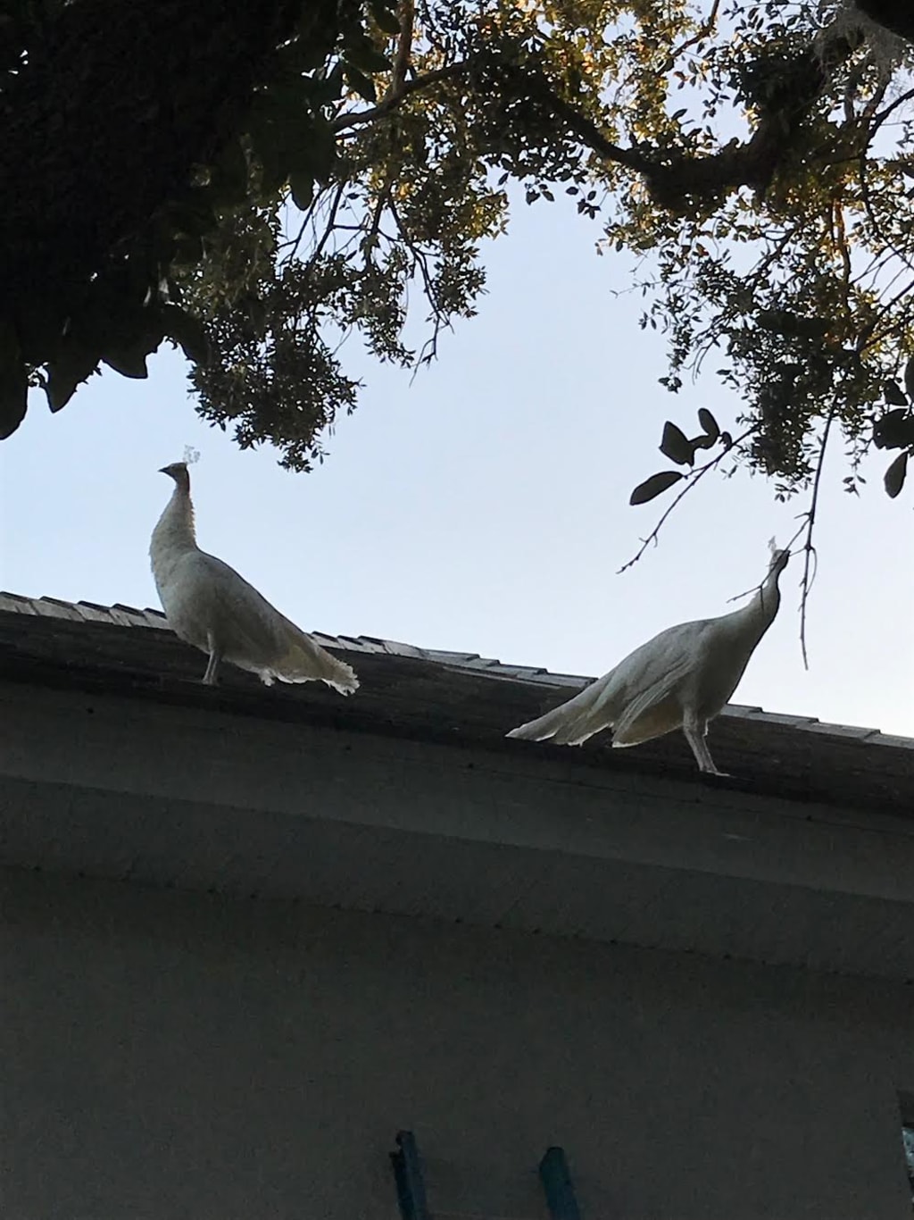 Bonnie and Clyde are peacocks. Snow white peacocks. Quite stunning to see.