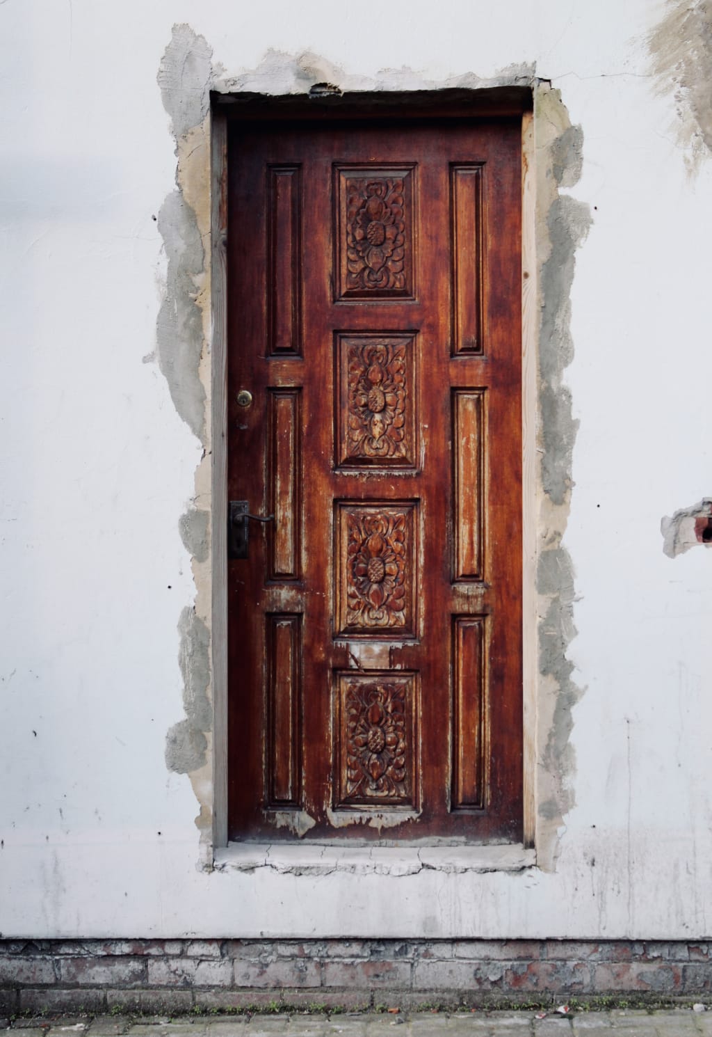 I was walking back from the store with shopping bags in my hands when I noticed it. The wood was coloured with a burnt orange varnish and adorned with delicately carved patterns, and despite being at least two feet up the wall, no steps were available for entry.