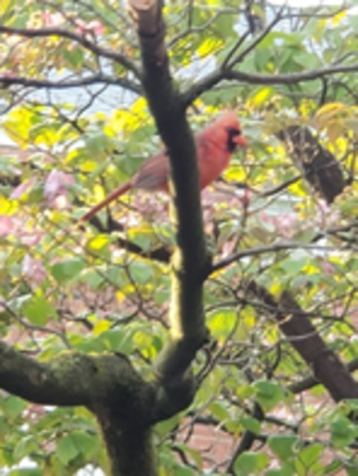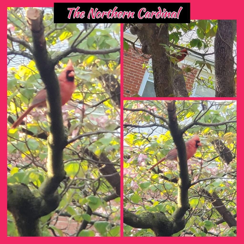 The sun was bright but there was a small breeze blowing. It was quite relaxing outside with nature. I had dug up most of the weeds and replanted and repotted the flowers and bushes that I had purchased from the local nursery. I had a folded blanket that I had placed on the stairs beneath me. I sat down to take a breath of fresh air when my phone rang. My daughter had called me, and she could barely hear my voice over the chirping and warbling birds. I had her on speaker. She laughed amazed by the constant bird chatter. My hands were dirty, and my cell phone was on the steps behind me when I spotted the cardinal. I whispered to her that the bird was back. She had seen my picture of the bird on Facebook. We smiled because someone had called him a Robin. He was breathtaking. His colors were bright and beautiful. The bird had landed on a high branch on a tree right in front of my view. I tried not to breathe too hard. I knew that the bird would take off in flight at the slightest movement by me or any other creature. I was happy that my neighbor’s calico cat who usually lounged outside was inside at the moment. I am not a skilled photographer so I knew that I could easily miss the shot. Birds aren’t going to pose for anyone, professional or not. The sun was blinding. I adjusted my eyes, held my breath, and took the shot. I found it strange that the same bird came back to visit me on the next day. I think he must've realized that he was now a star since I had posted a picture of him on Facebook. I think he came back for his close-up.