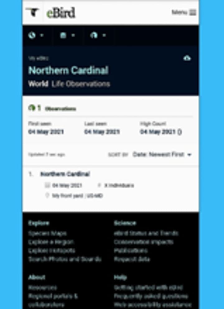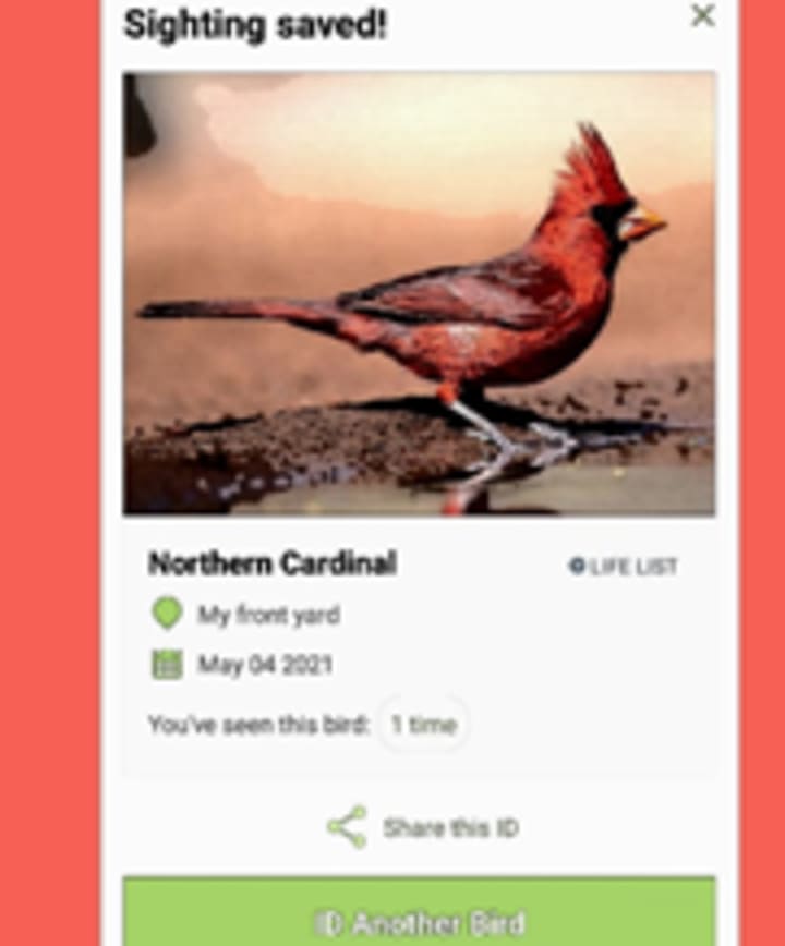 My search was successful. I was able to upload the picture of my bird and discovered that it was a male Northern Cardinal. It stated that my bird was a striking and familiar backyard bird throughout most of eastern North America, Southwestern U.S. and even Mexico. Although he didn't make a sound that day, I read that he has a high-pitched metallic chirp and a series of loud. sweet whistles. Based on the information on the app, I learned that the females were brownish with red wings and tails.