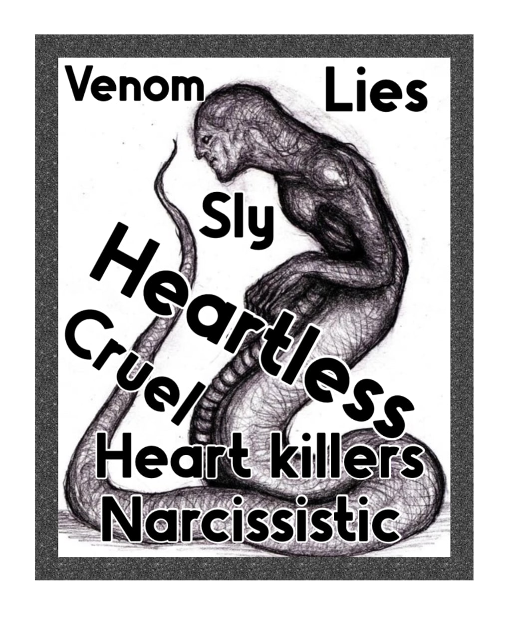 Well-wrought! However, as a man, I must say that such reptilian minds are certainly of both the male and female persuasion. A society like our own, which erroneously equates pleasantry with civility, is a perfect breeding ground for such creatures, and we are many generations in. But eventually, strong souls become immune to the venom, and the snakes are left with only the rats to eat...