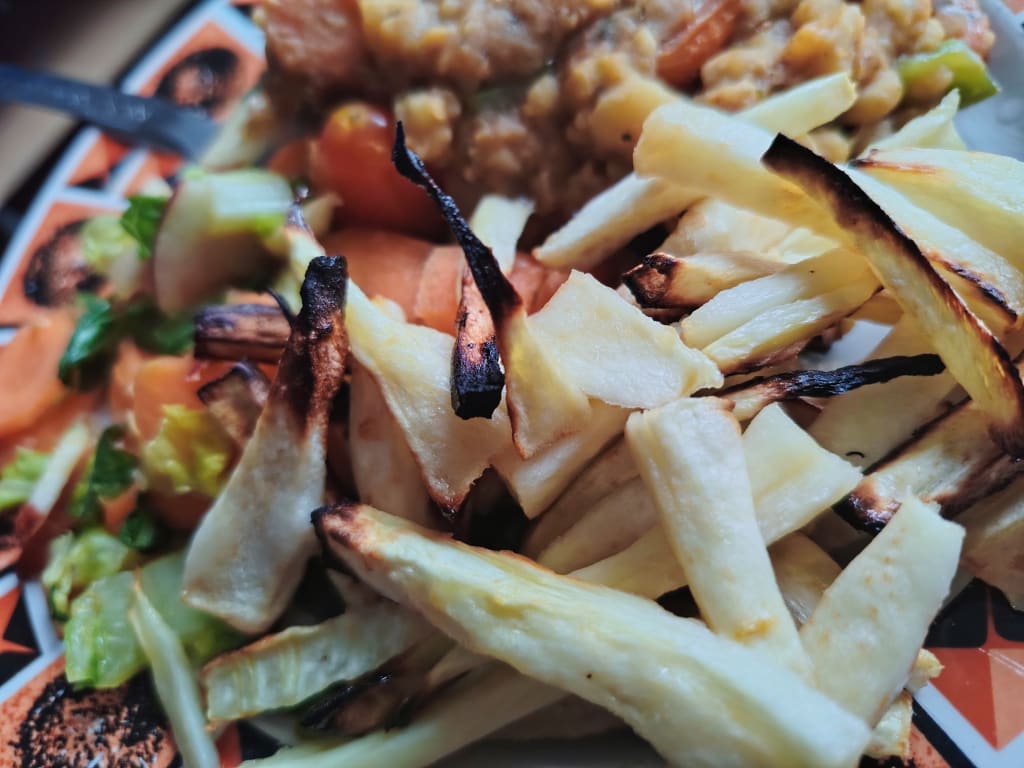 With parsnip spears both crisp and pale with fire—
