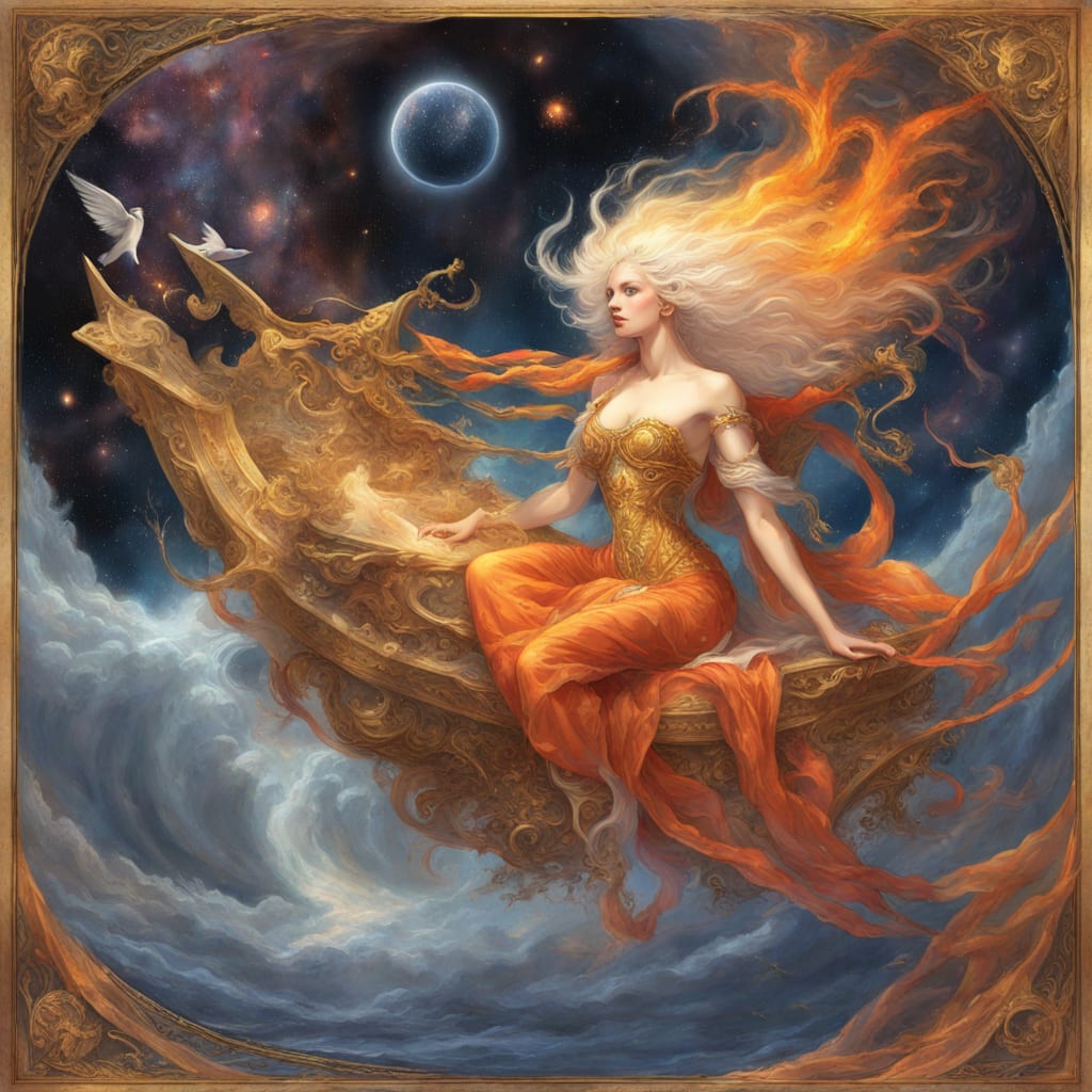This is the story of a cosmic entity being born from the stars themselves and finding its place in the cosmos. As with many forces of nature, we tend to personify them and attribute will, so I gave the concept of song a purpose and personal voice as she found her throne to recline upon. Watching the universe continue to revolve on its course as she spreads the symphony of the stars.