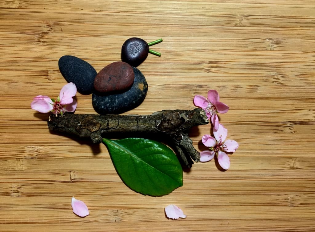 I love creativity. With a few pebbles, twigs, and botanicals, I can paint a peaceful nature theme. Here, it’s spring, Indian hawthorn is in bloom and a finch is singing.