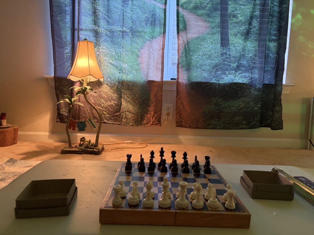 My husband and I play in my writing room on my dad’s chessboard.