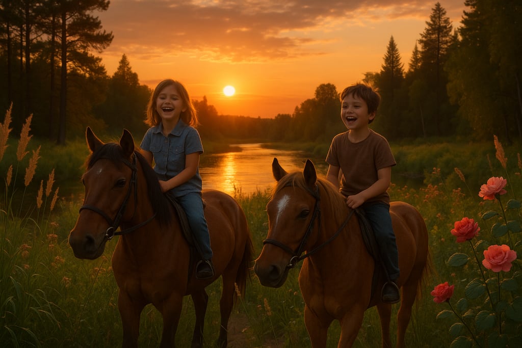 At sunset, joyful children ride horses through tall weeds and blooming roses by a serene river, surrounded by snobar trees, capturing nature’s beauty and the spirit of freedom.