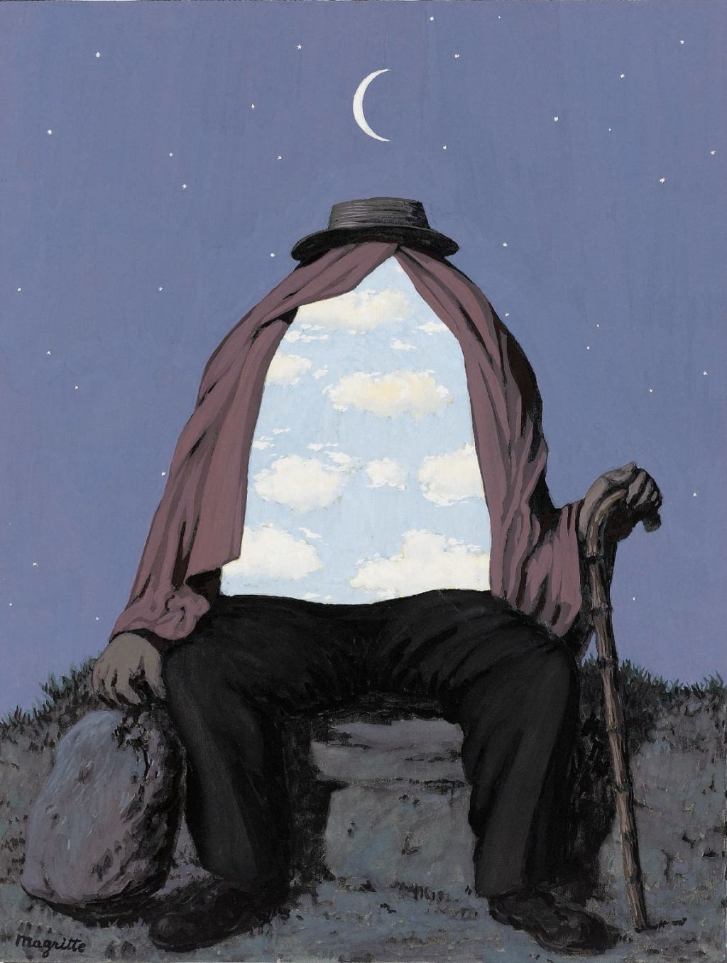 “A vacant variable; a cloaked void Coat, hat and cane framing empty, blue sky” what strong ekphrastic lines!