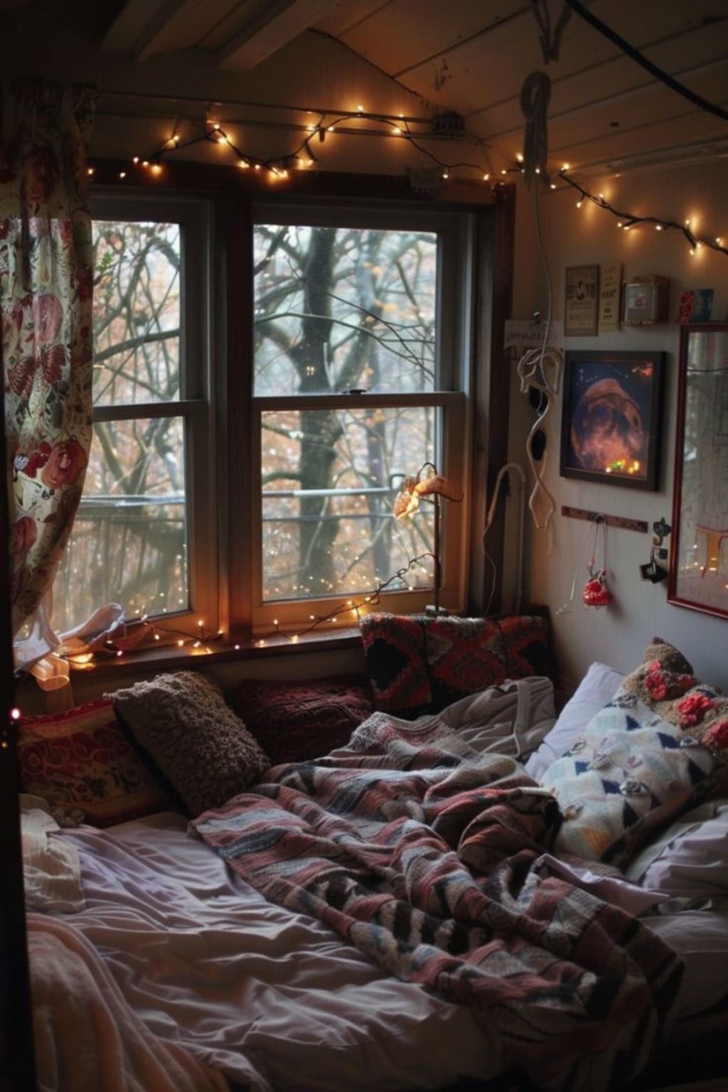 In a room with twinkling lights, soft blankets beckon warmly. Plants and memories intertwine, creating a serene and divine space. Whispers of dreams in the evening glow, where time moves gently and slow. A haven of peace, where hearts can rest, in this cozy corner, life feels blessed.