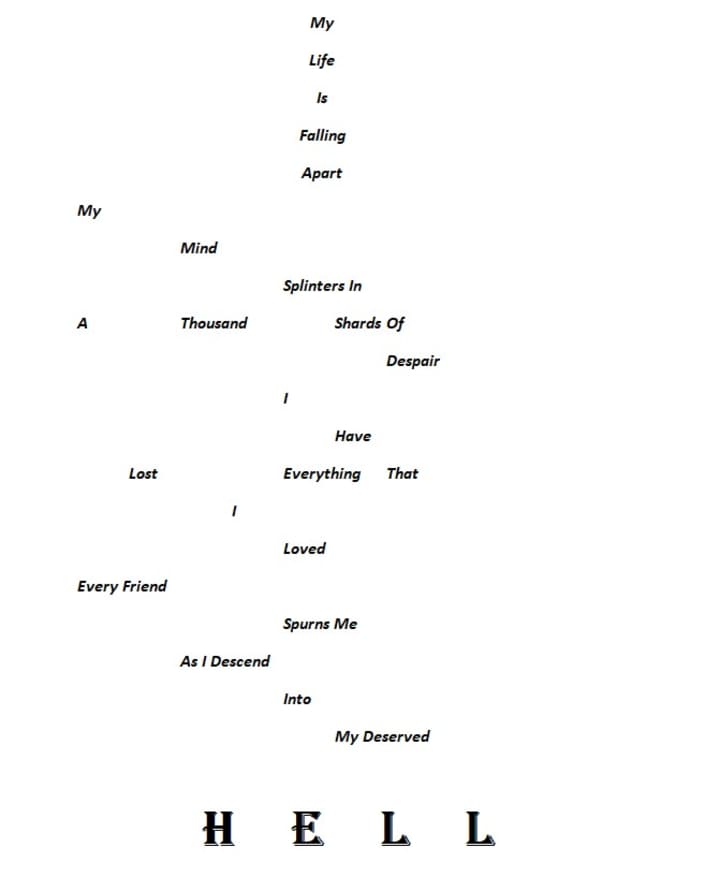 It is an attempt at visual free-form poetry for someone who is falling apart, below is what I would like it to look like.
