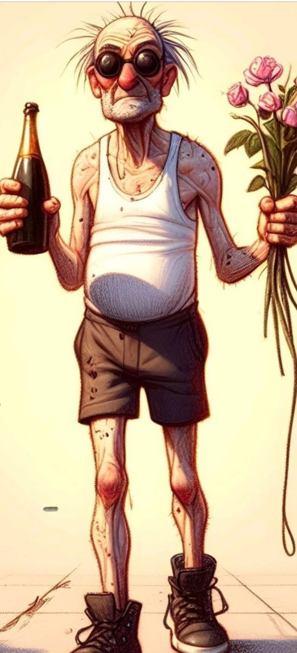 In the other, some flowers—though wilting, a mess,