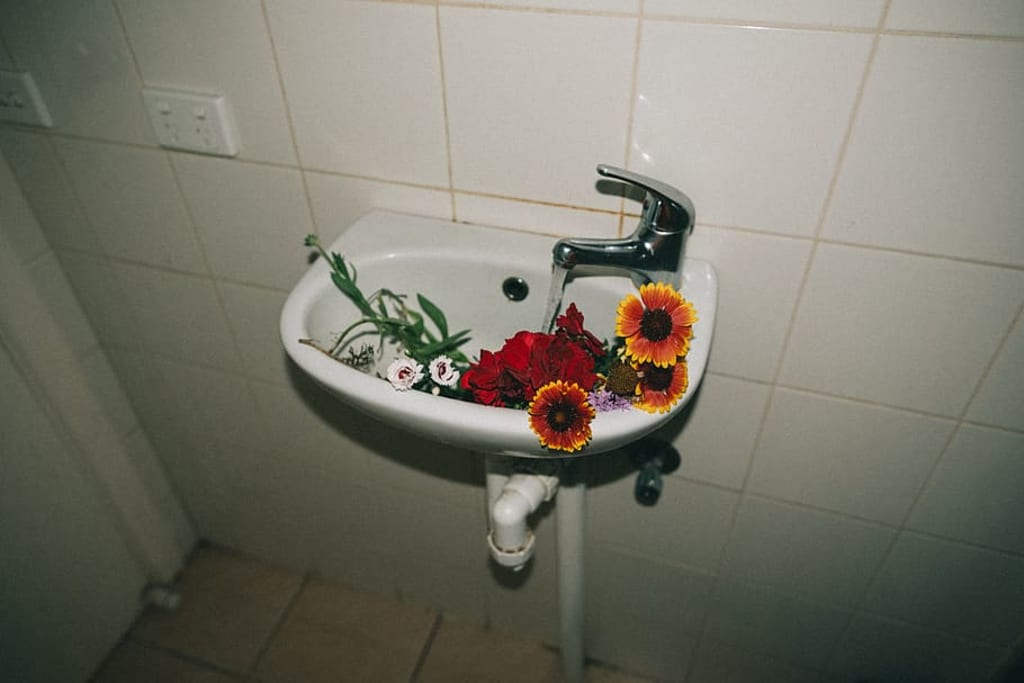 Little sink with no legs and exposed pipes in a grimy bathroom, its faucet running over freshly picked flowers.