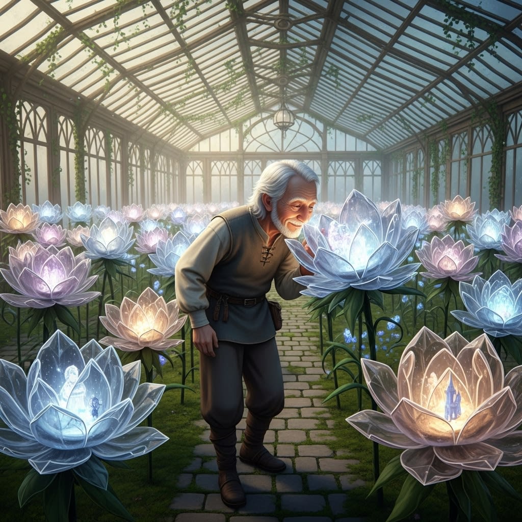 His greenhouse stands where twilight stays,