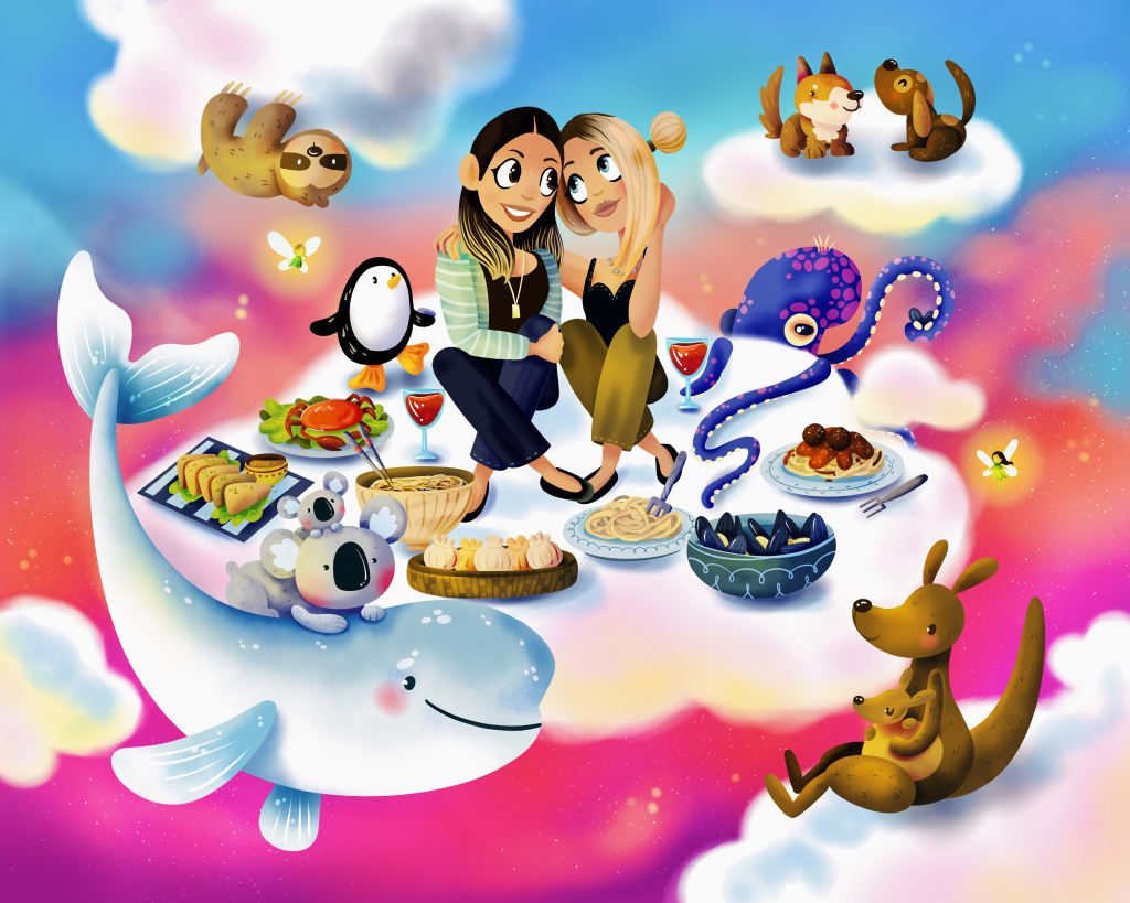 The girls hop onto the cloud of cuisines & it hands them their favorite drink.