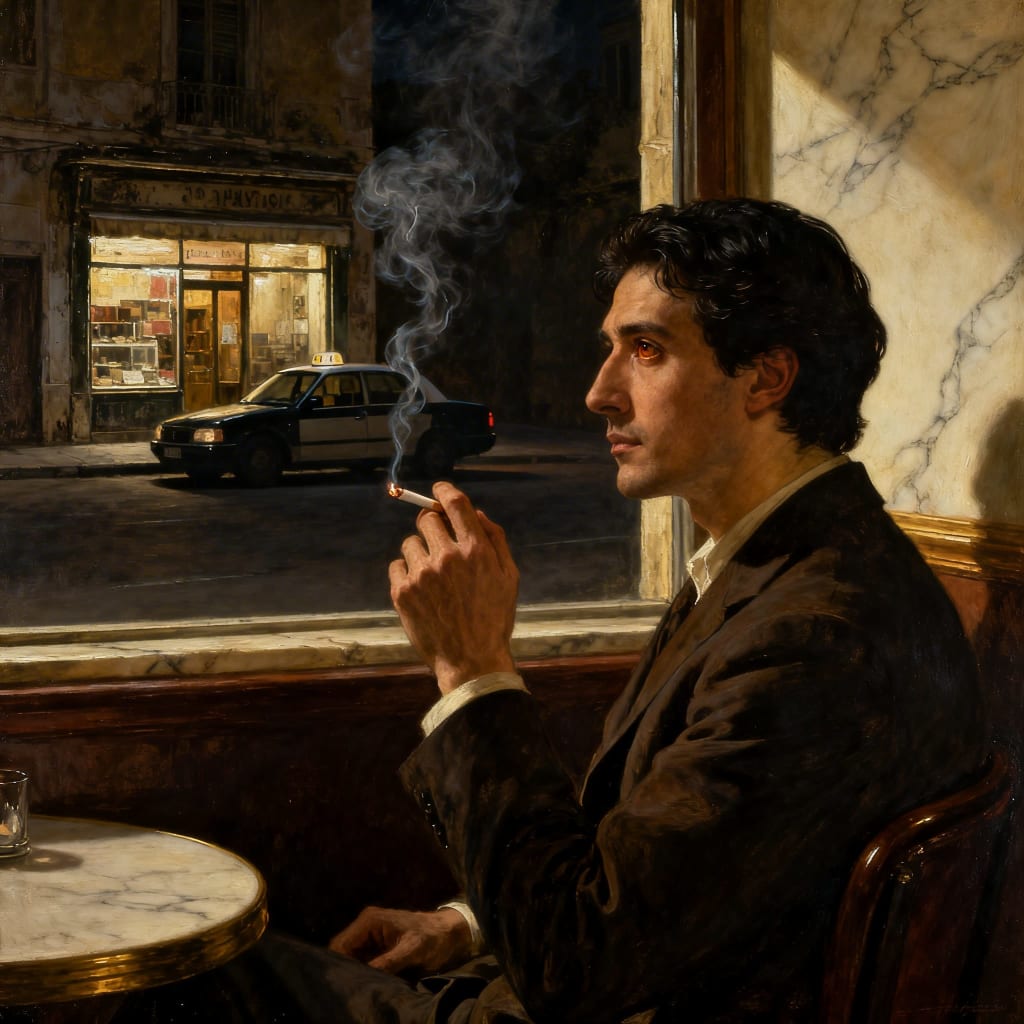I'm waiting in a café. I got dressed, thinking we might have had a talk. Shouldn't we? Am I next to the window, looking? Perhaps you could see me. For now, I'm looking for the old shop. It has always been there since I arrived in this city.