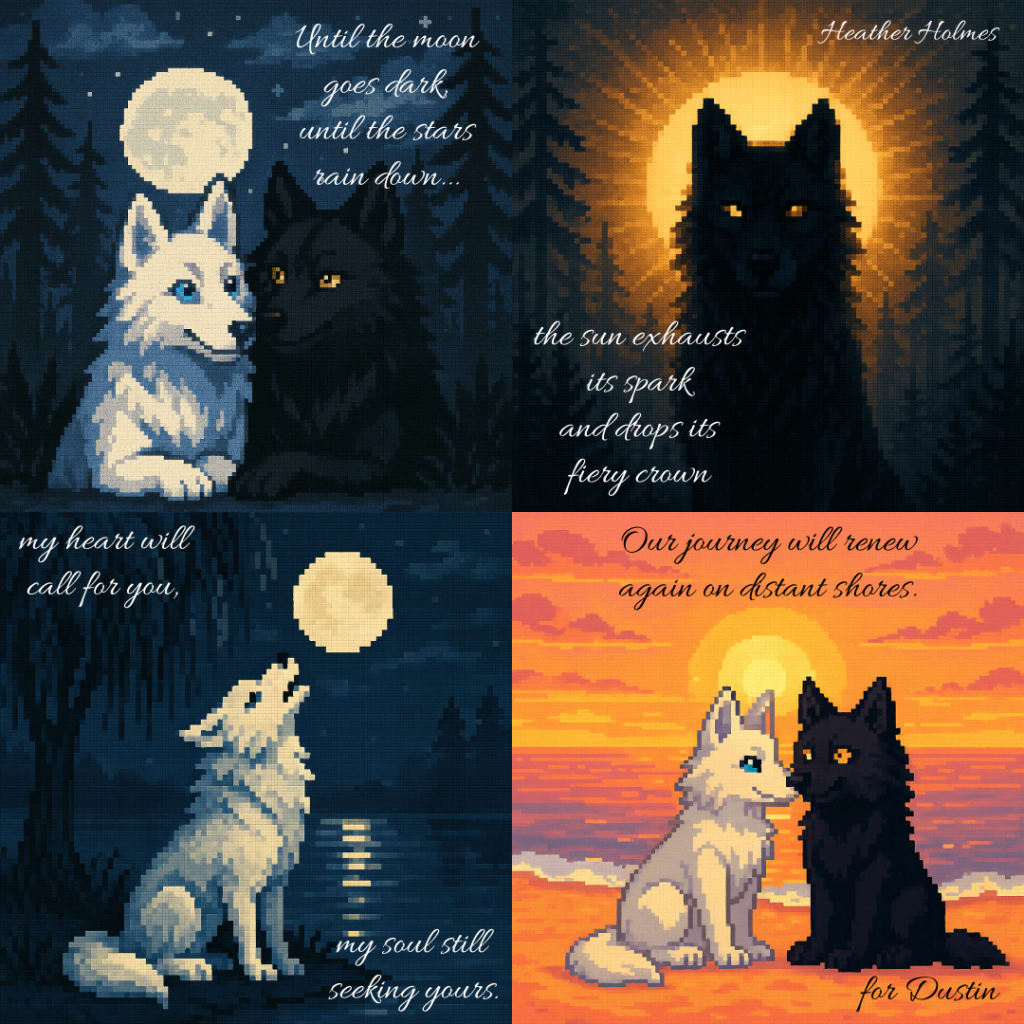 Pixel art of a white wolf and a black wolf, the dearest of friends who are tragically separated but find their way back to each other