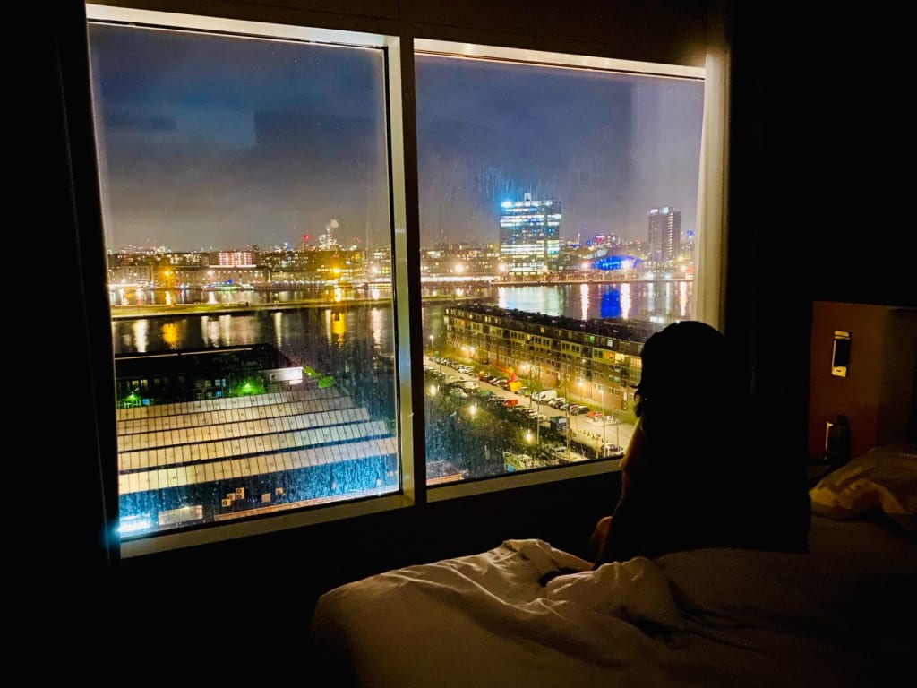 From my bed, I can see the window that takes up the entire wall. The curtains are double-layered, gray and heavy, with a firm authority to block out the sun’s rays. But now it’s nighttime, and all that’s visible are the lights of the buildings and the lights poles, and of course, the opulent city of Amsterdam, which feels as if it’s right next to the bed—or better yet, as if it’s inside the room.