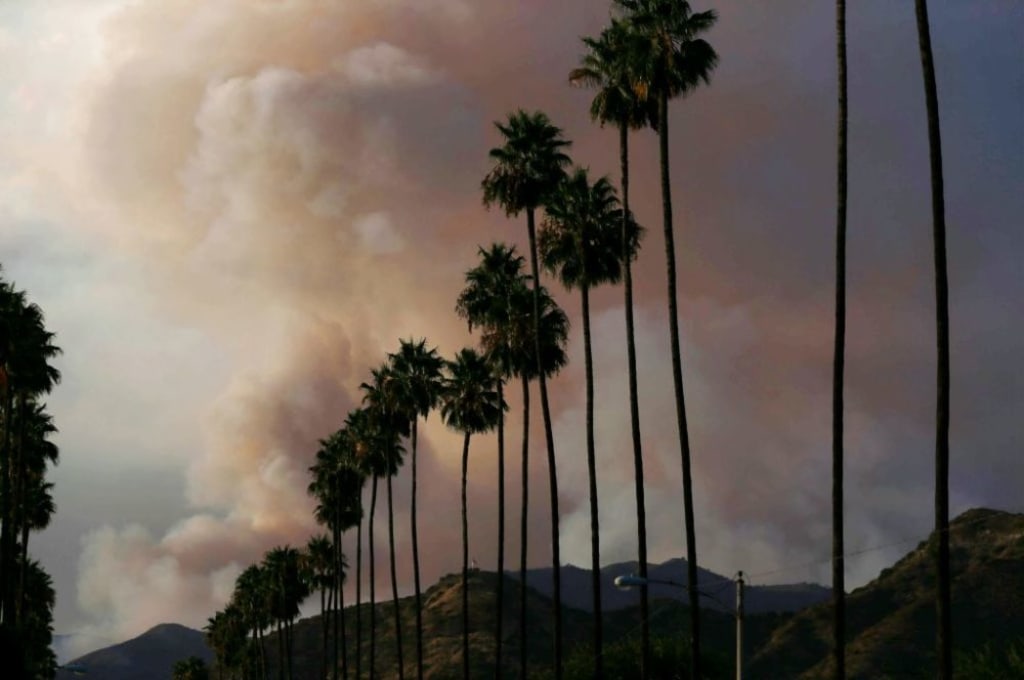 California hills fenced by palm trees with a smoky red and blue sky, literally. It's a wildfire.
